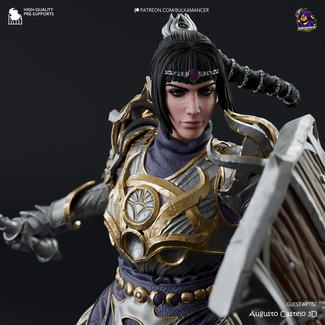 • Painted version: Gold and silver armor highlights, purple cloth with shadowy tones, realistic skin shading