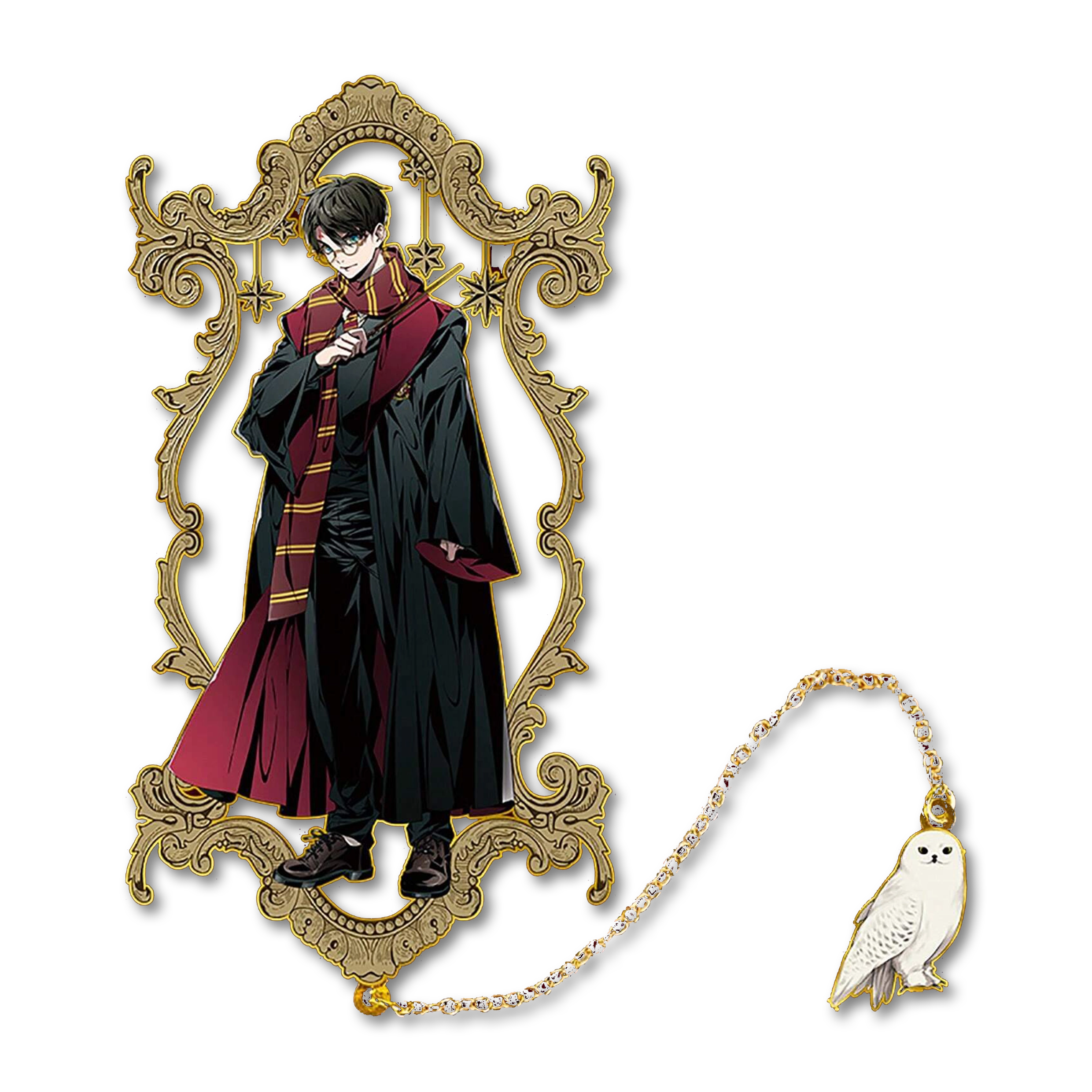 The refined gold frame surrounds the character illustration in a way that feels both classic and sophisticated. Moreover, the delicate star accents enhance the magical aesthetic, while the attached owl charm adds movement and charm to the overall design. In addition, the fine chain detail creates a balanced composition, making the bookmark visually striking even when placed inside a book.