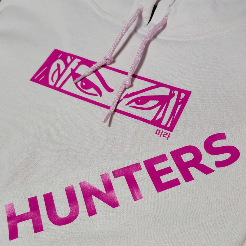 This eye-catching hoodie features a panoramic print of Mira’s captivating eyes on the chest, paired with her name in Korean script. The sleeves proudly display the bold text DEMON HUNTERS — a tribute to her strong, determined persona and her role in the story.