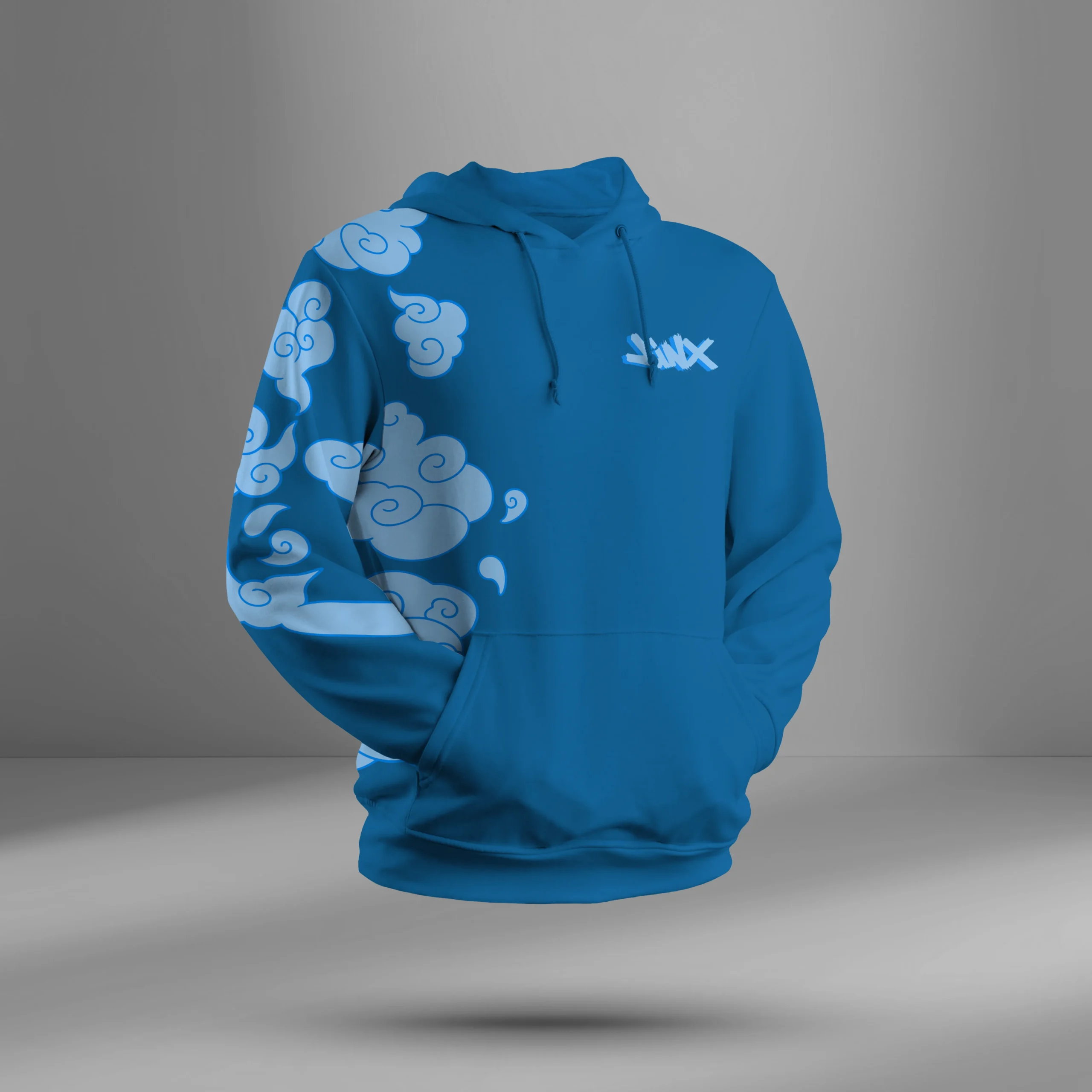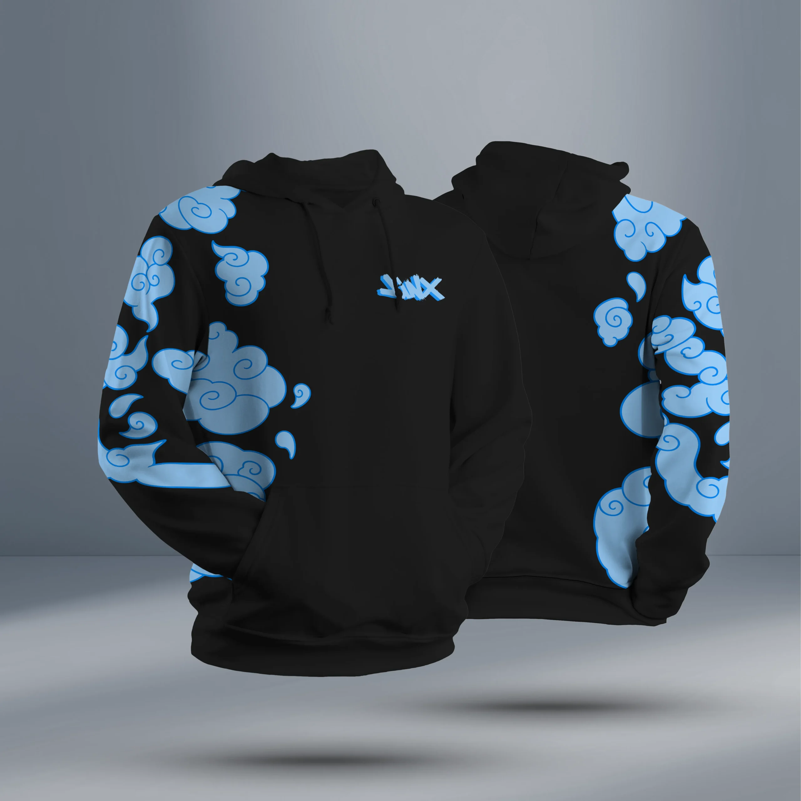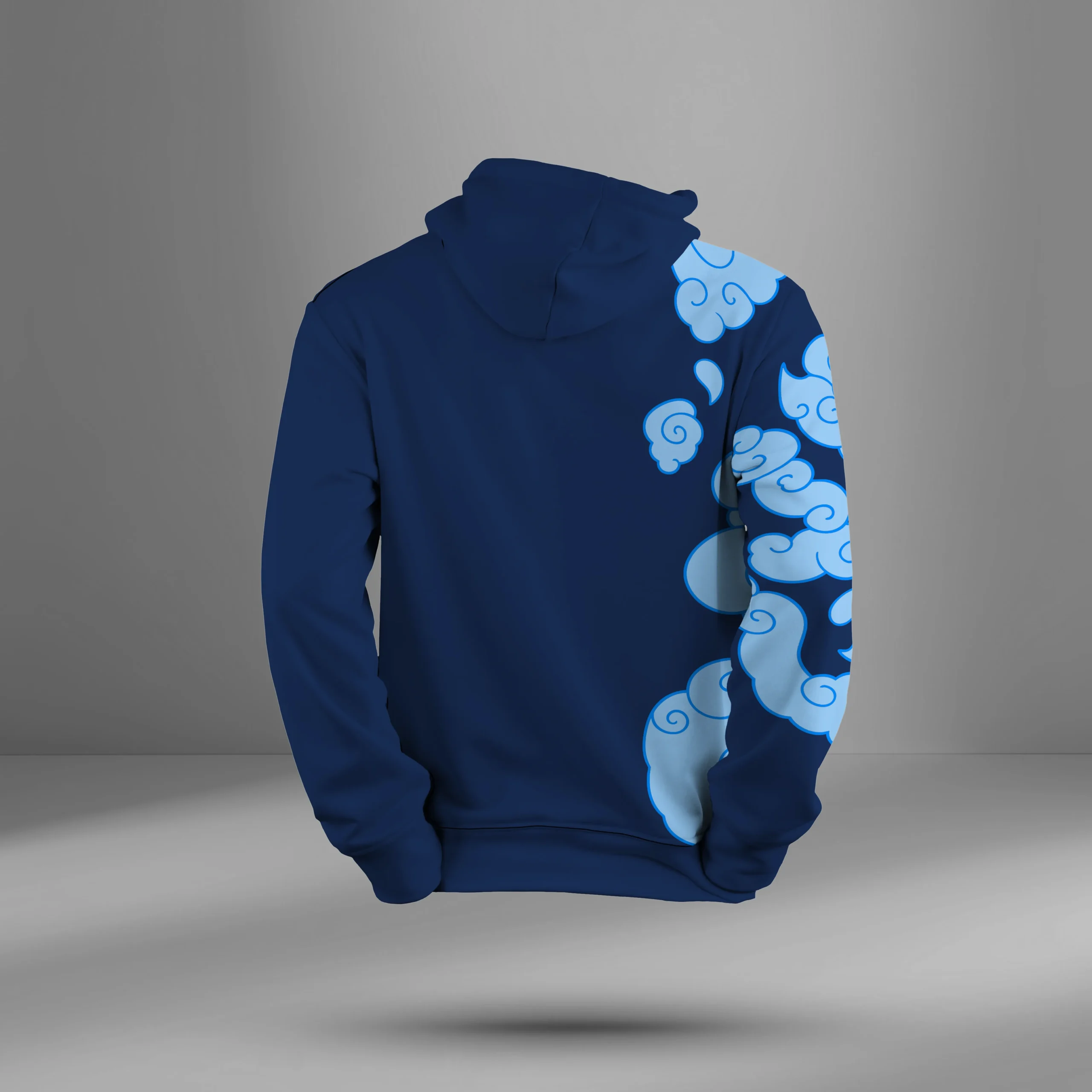 Moreover, the flowing blue cloud elements wrap naturally around the arms and shoulders. In addition, the minimal chest detail keeps the design balanced and wearable for everyday outfits. As a result, the hoodie feels both powerful and clean. Therefore, it works perfectly as a statement piece while still being comfortable and versatile.