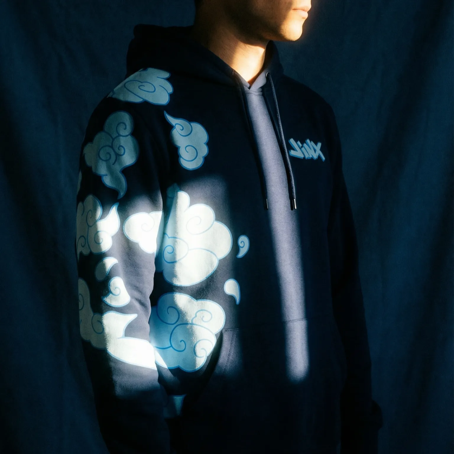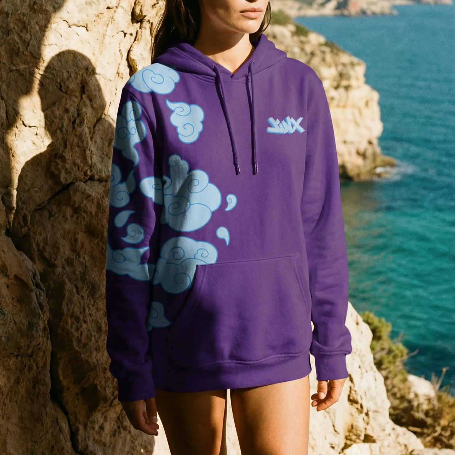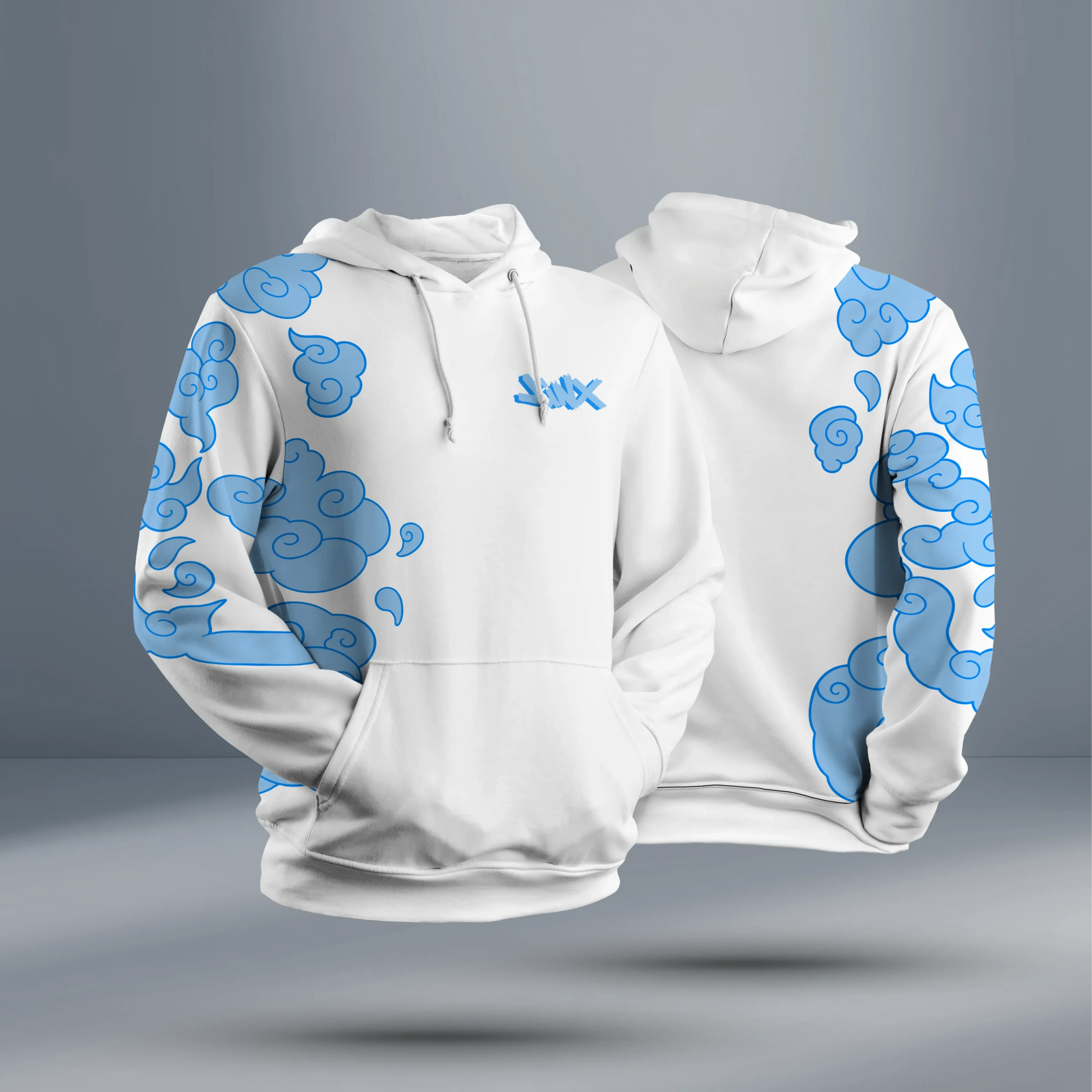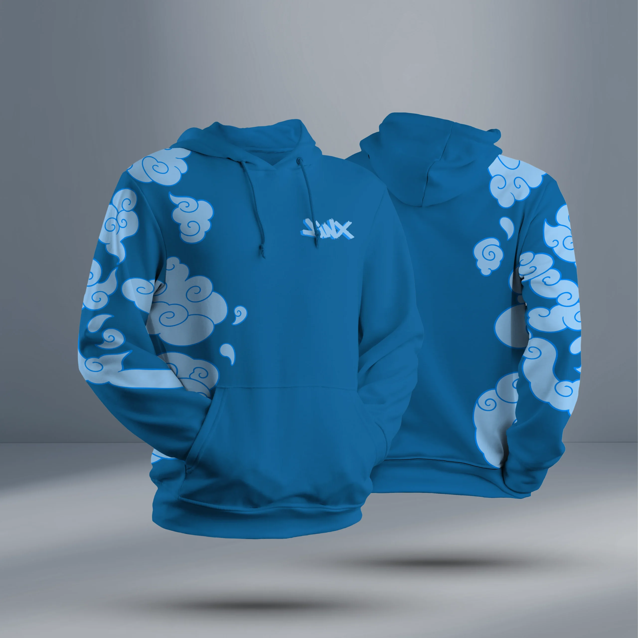 Moreover, the flowing blue cloud elements wrap naturally around the arms and shoulders. In addition, the minimal chest detail keeps the design balanced and wearable for everyday outfits. As a result, the hoodie feels both powerful and clean. Therefore, it works perfectly as a statement piece while still being comfortable and versatile.